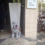 Estátua de um schnauzer na entrada do bar